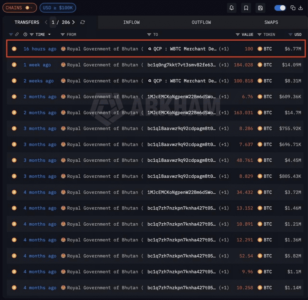 The Royal Government of Bhutan has transferred another 100 Bitcoin, worth approximately $6.77 million, to a WBTC merchant deposit address linked to QCP Capital, according to onchain data from Arkham Intelligence.