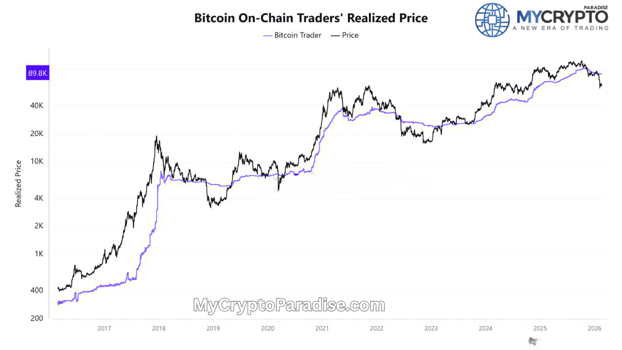 💎Based on our exclusive on-chain data, Bitcoin drops from one of the most important structural support levels in its cycle history. The realized price of mid-weight active traders, wallets holding between 10 and 10,000 BTC with coins moved within the past one to three months, is sitting near $89,800. BTC has not traded above this level since mid January 2026.