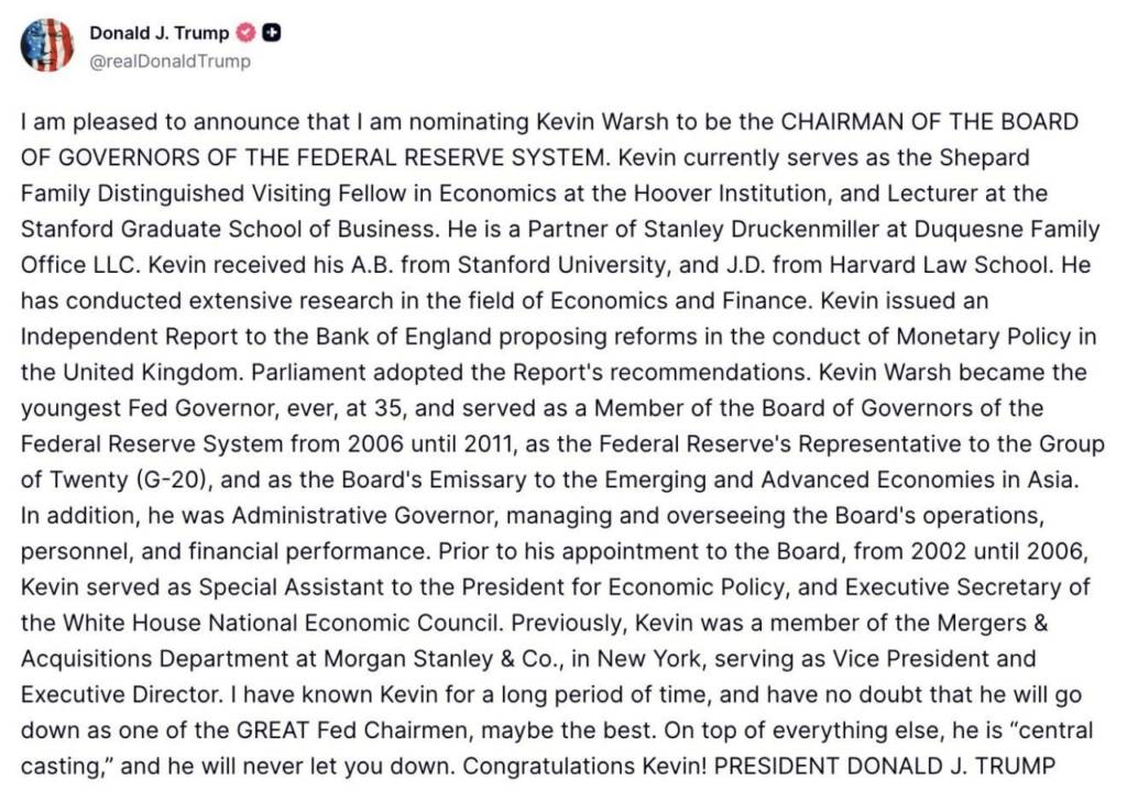 The official nomination announcement expected next week is the first catalyst. Beyond that, attention will shift quickly to Senate confirmation dynamics, where resistance from certain lawmakers could delay or complicate the process.