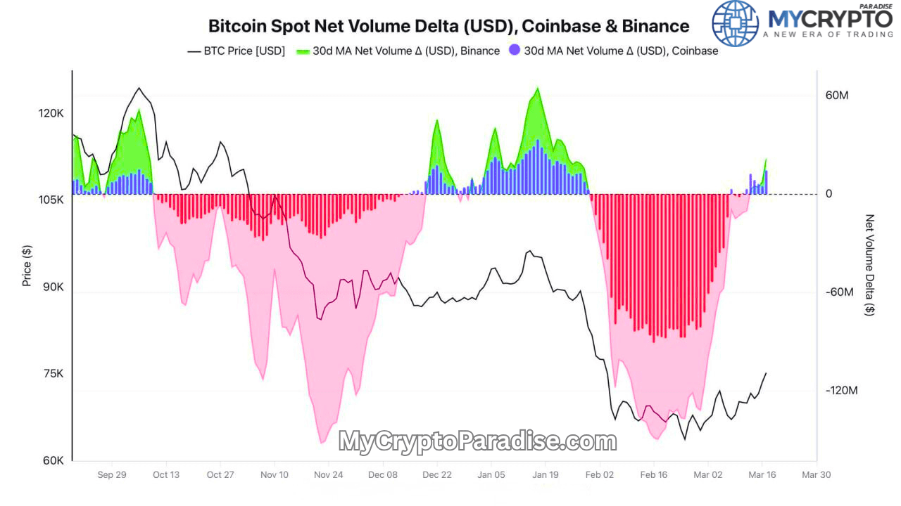 💎In February, the market was in a full distribution phase, with deeply negative deltas (-$145M Binance / -$88M Coinbase). That tells us both retail and larger players were aligned on the sell side, a classic setup where panic dominates and weak hands exit. But now? We’re seeing a shift to + territory (+$21M / +$14M). Volume delta turns positive, and this is not random. This is early accumulation behavior, often seen before expansion phases.