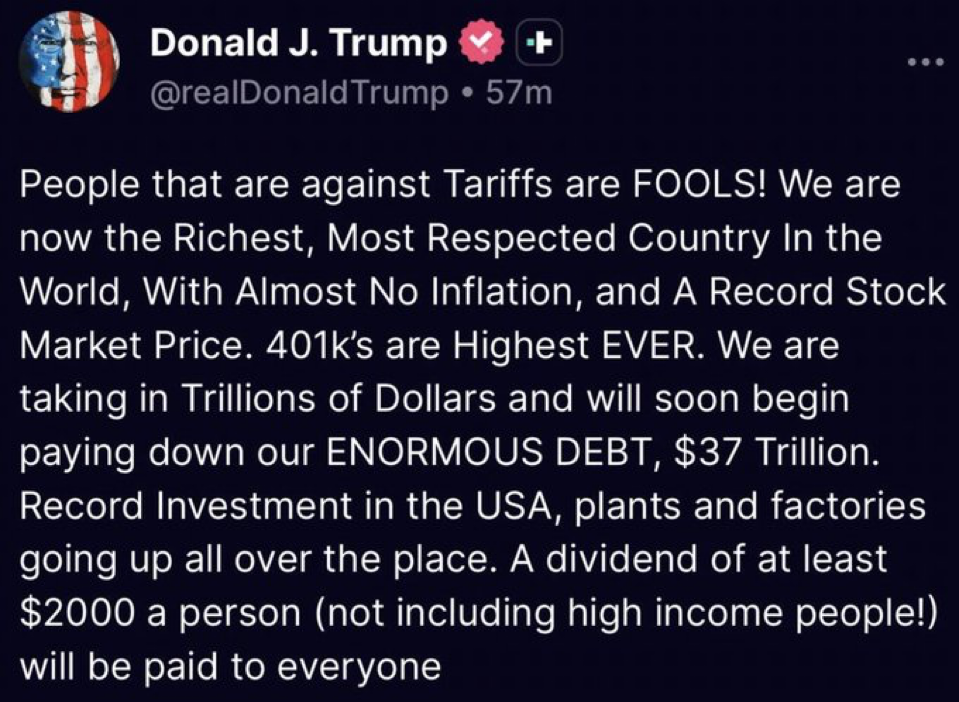 The unexpected pledge came via Truth Social, where Trump declared, “People that are against Tariffs are FOOLS! We will pay a dividend of at least $2,000 a person (not including high-income people!).”